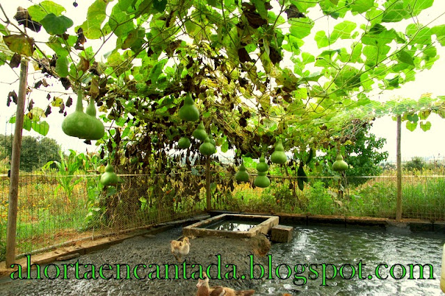 Todos os dias trocamos a água dos patos. Para o efeito utilizamos a água do poço. Neste momento o laguito dos patos está sob dimensionado porque as patas deram-se tão bem que criaram todas este ano. Mas daqui a umas semanas tudo irá voltar à normalidade. Um pato e três patas.